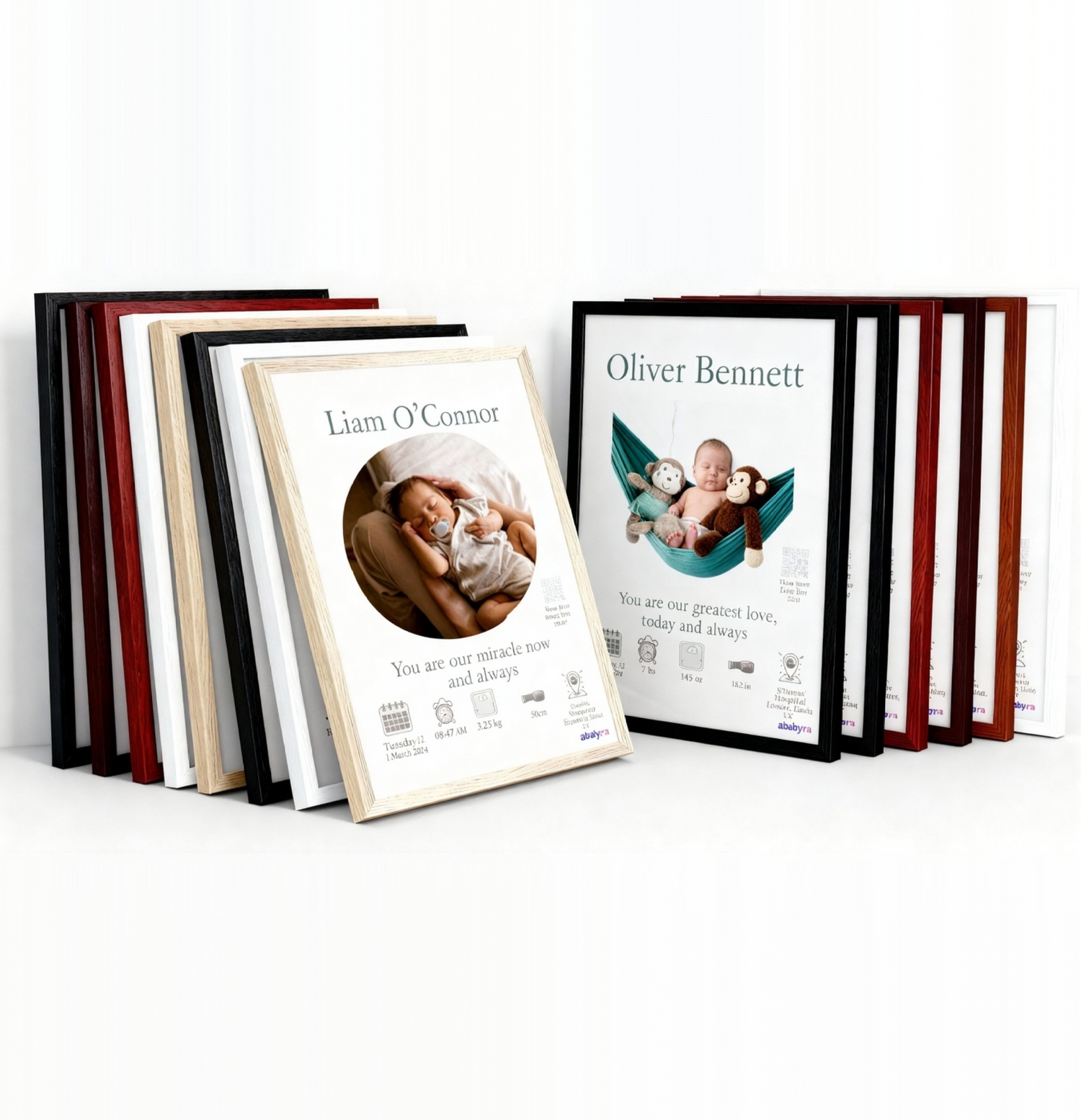 Preserve the moment your world changed with an Ababyora framed poster, printed on 200 gsm matte paper with a smooth, non-reflective finish and protected by shatterproof plexiglass. The durable pine wood frame adds warmth and charm, turning your baby’s photo into a lasting piece of art.